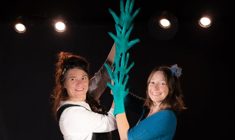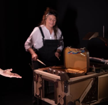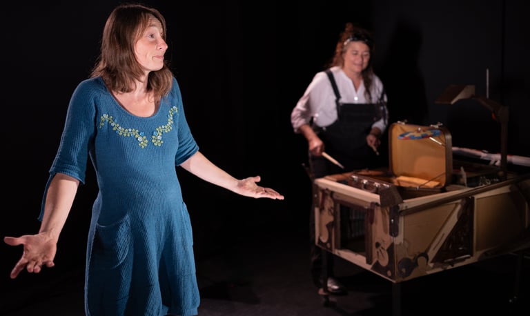 Émilie et Claire arrivent sur scène avec leur drôle de machine, enfin, c'est surtout celle de Claire ! Elle bichonne sa « machine », c’est sa source d’inspiration, son refuge à elle. Claire, raconte avec son corps. Ses mains rythment les sons et animent les ombres. Émilie est conteuse, avec les mots. Son univers, c'est sa chaise qui appelle au souvenir des veillées où l’on se partageait ces histoires qui ont voyagé de bouches à oreilles.